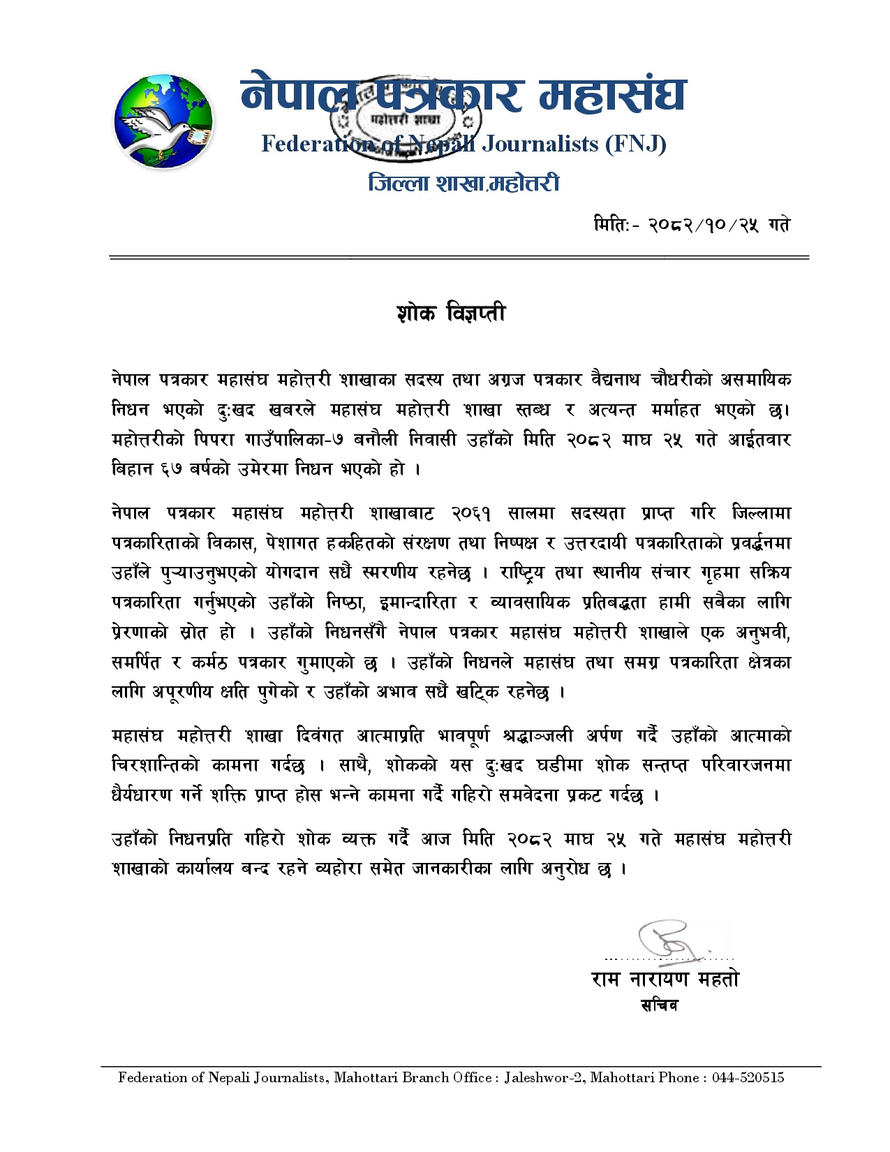 नेपाल पत्रकार महासंघ महोत्तरी शाखाबाट २०६१ सालमा सदस्यता प्राप्त गरि जिल्लामा पत्रकारिताको विकास, पेशागत हकहितको संरक्षण तथा निष्पक्ष र उत्तरदायी पत्रकारिताको प्रवद्र्धनमा उहाँले पु¥याउनुभएको योगदान सधैं स्मरणीय रहनेछ । राष्ट्रिय तथा स्थानीय संचार गृहमा सक्रिय पत्रकारिता गर्नुभएको उहाँको निष्ठा, इमान्दारिता र व्यावसायिक प्रतिबद्धता हामी सबैका लागि प्रेरणाको स्रोत हो । उहाँको निधनसँगै नेपाल पत्रकार महासंघ महोत्तरी शाखाले एक अनुभवी, समर्पित र कर्मठ पत्रकार गुमाएको छ । उहाँको निधनले महासंघ तथा समग्र पत्रकारिता क्षेत्रका लागि अपूरणीय क्षति पुगेको र उहाँको अभाव सधैं खट्कि रहनेछ ।